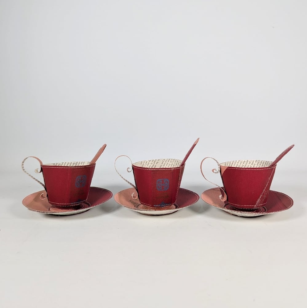 To celebrate the 250th Anniversary of Jane Austen's birth I have created JUST THREE one off decorative stitched teacup, saucer and spoon sets, made from vintage end of life copies of three of her most loved titles: 'Pride and Prejudice', 'Sense and Sensibility' and 'Emma'