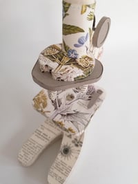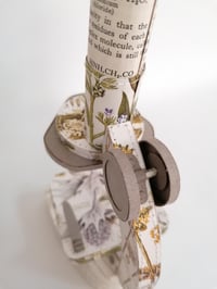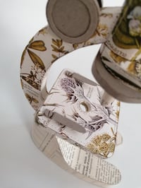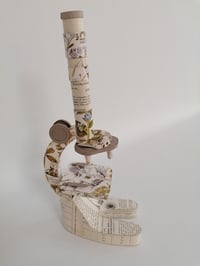 A decorative Paper Microscope created from vintage botanical illustrations and Biology textbooks, with the paper being the inspiration for the piece, as well as the media it is made from. The work is created by manipulating and stitching the found paper to create the form. This is one of the few pieces I make that includes moving parts.